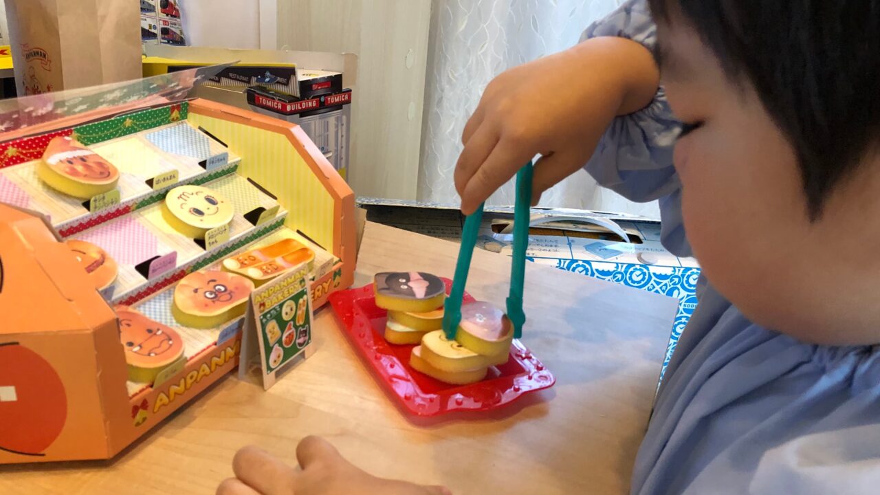 少し小さいと、パンをトングでうまくつまめないかもしれませんが、親子のやりとりで、アレンジして楽しく遊べる要素満載です。
